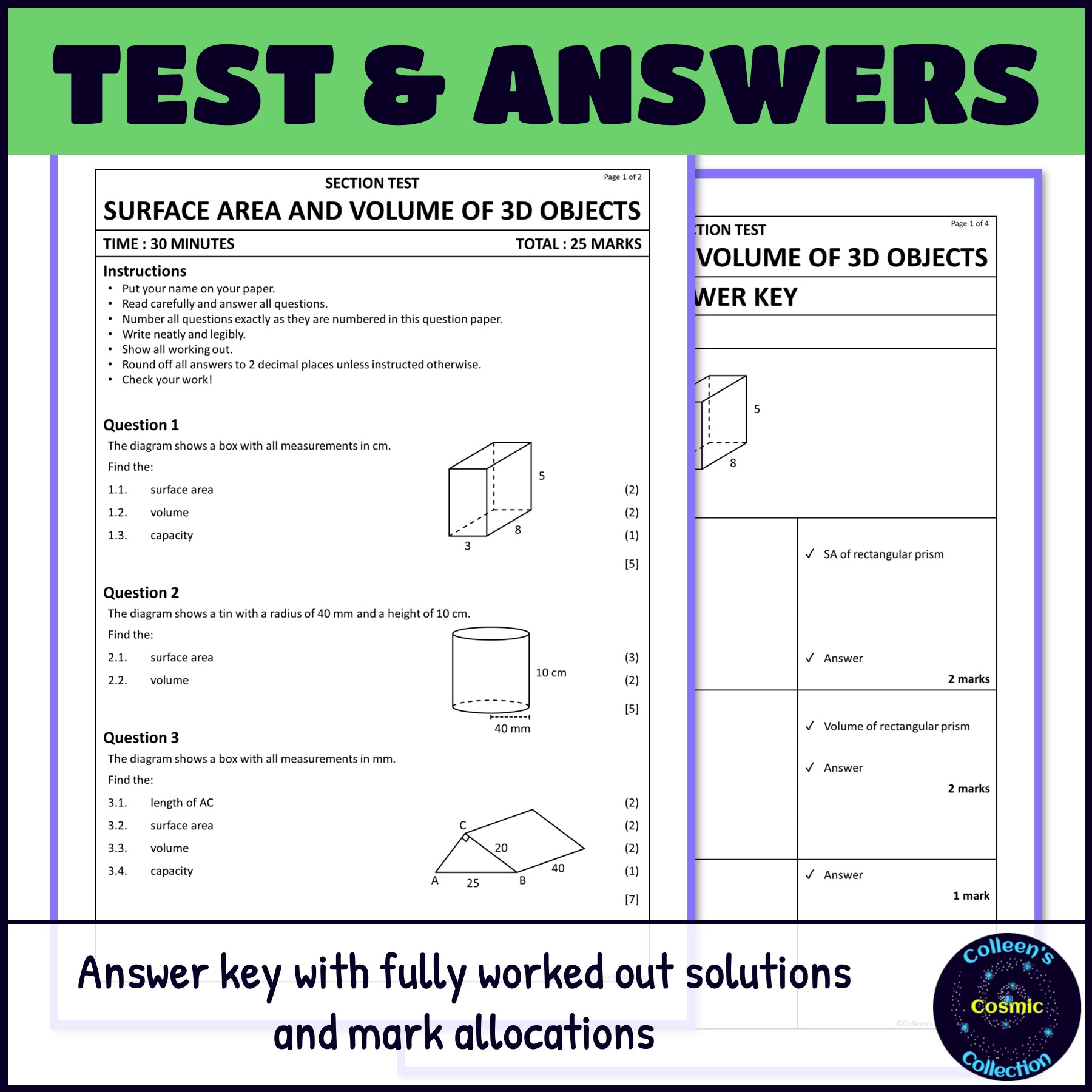 Looking for a ready-to-use, CAPS-aligned test on volume and surface area of 3D objects for Grade 9 Mathematics? This printable assessment pack is designed to evaluate learners’ understanding of key Term 3 measurement concepts, while saving teachers valuable prep time.