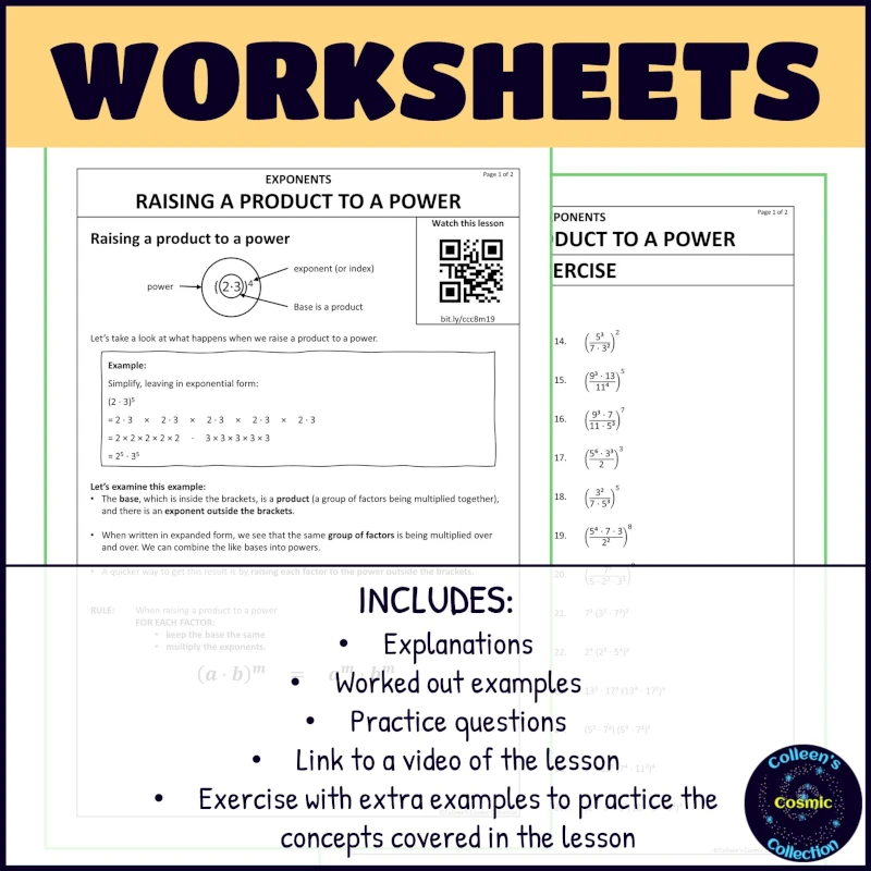 Introducing our comprehensive worksheet bundle designed to complement the educational video lesson on Raising a Product to a Power! Whether you’re a dedicated teacher looking to enhance your classroom resources or a parent seeking extra practice material for your child, these worksheets are the perfect educational companion.