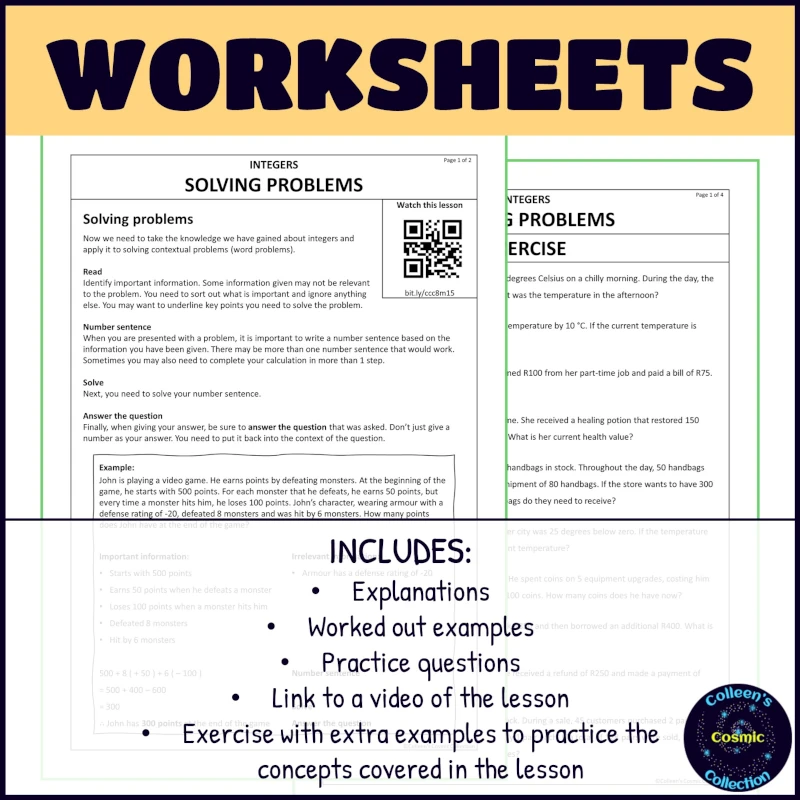 Introducing our comprehensive worksheet bundle designed to complement the educational video lesson on Word Problems with Integers! Whether you’re a dedicated teacher looking to enhance your classroom resources or a parent seeking extra practice material for your child, these worksheets are the perfect educational companion.